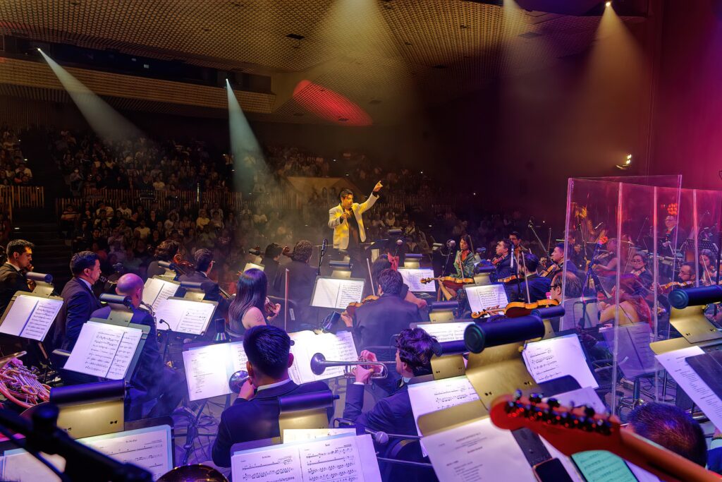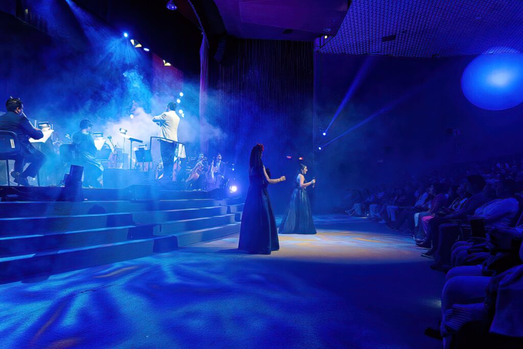 Evento imperdible lleno de luz, trajes de gala y bellas coreografías con lentejuela brillante que destella frente a la impecable ejecución de la Filarmónica de las Artes, que nos hace retumbar el corazón con la fuerza de sus cuerdas, percusiones y vientos, dirigidos con gran pulcritud por el Director Abraham Vélez Godoy.