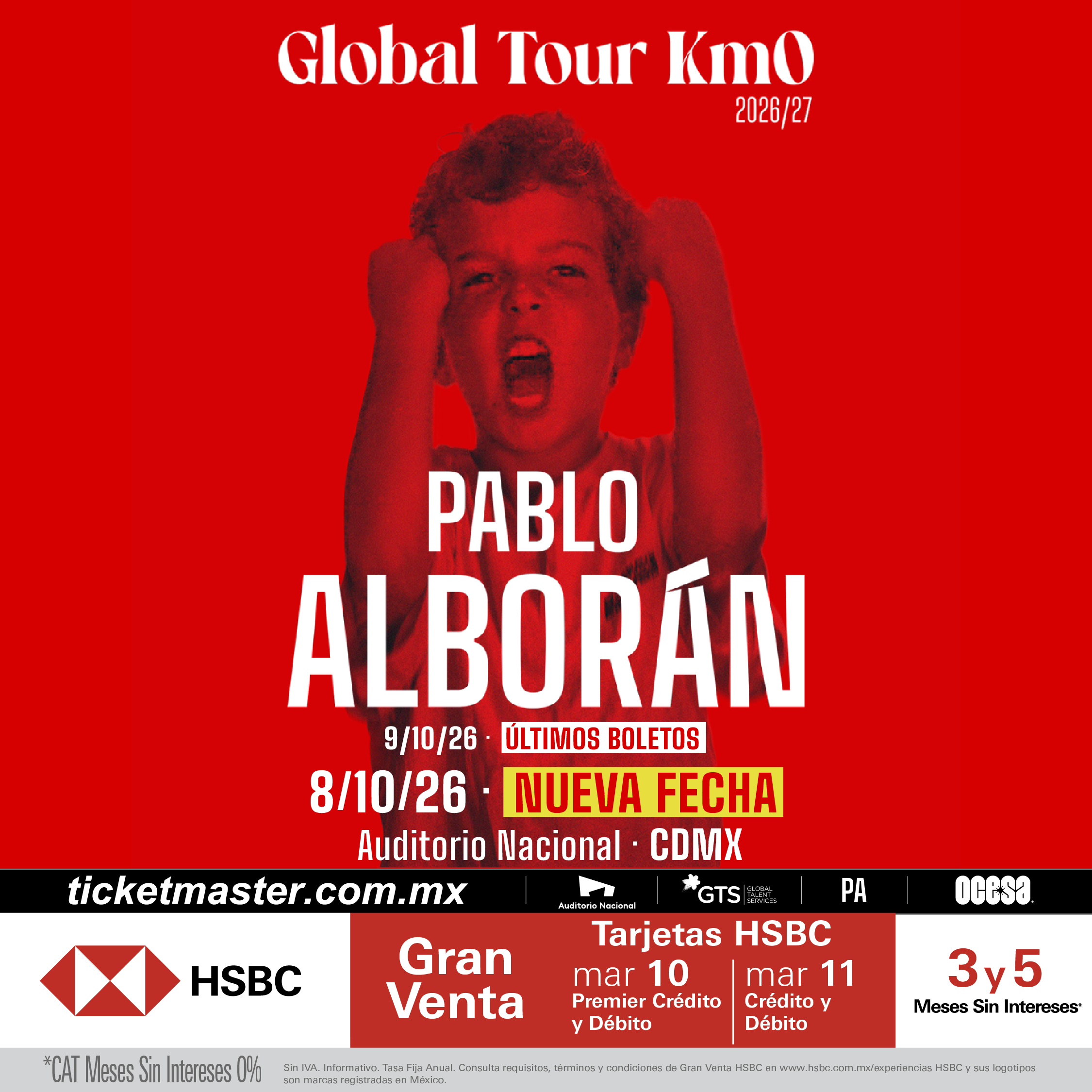 Tras el rotundo éxito de ventas para su presentación del 9 de octubre, el cantautor malagueño Pablo Alborán ha confirmado una segunda fecha en el Auditorio Nacional de la CDMX para el 8 de octubre. Esta visita forma parte de su ambiciosa gira mundial KM0 2026-2027, la cual respalda su séptimo álbum de estudio homónimo lanzado en 2025.