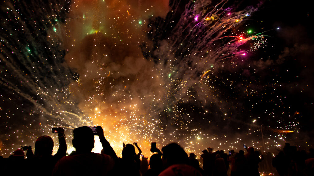 En las casas o en la calle te topas los altares con veladoras e imágenes, peregrinaciones, las pachangas con las ferias y sus castillotes con pirotecnia.