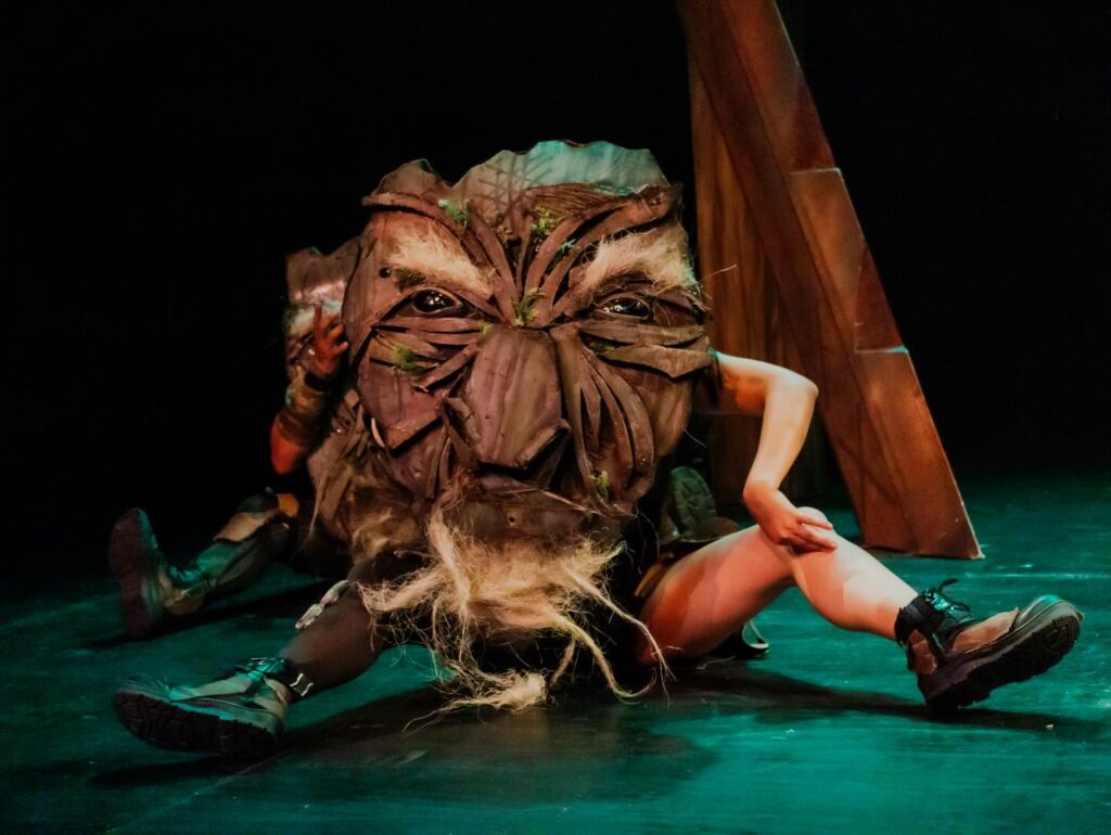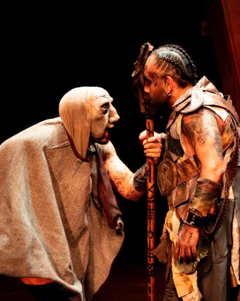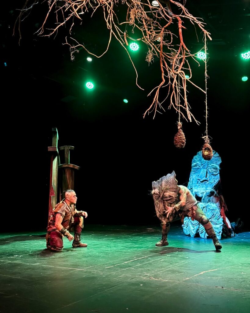En esas cuatro paredes viajamos por los reinos de la mitología nórdica. Conocimos personajes profundos y complejos, apoyados en elementos sencillos pero poderosos: máscaras gigantes, una escenografía precisa y multifuncional, y coreografías que nos permiten presenciar el Ragnarök y sus batallas épicas sin romper nunca la ilusión teatral.