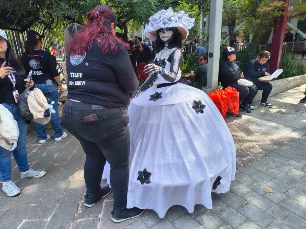 Ver a las catrinas morder pan con los labios pintados de negro era una postal absurda y perfecta: el hambre no distingue maquillaje.