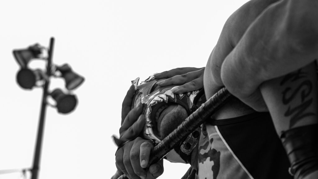 En una esquina del ring se miraba a dos de los contrincantes luchando con fervor; le querían arrancar la máscara a uno de ellos, al fondo de la escena se oía claramente: